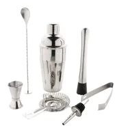 7 db-os rozsdamentes acél koktél szett bambusz tartóban. Tartalma: koktél shaker (550 ml), mérőpohár, szűrő, bárkanál, keverő, jégfogó és egy adagolókupak.