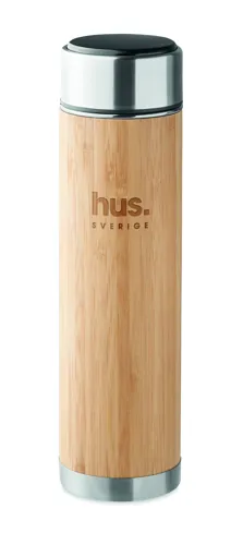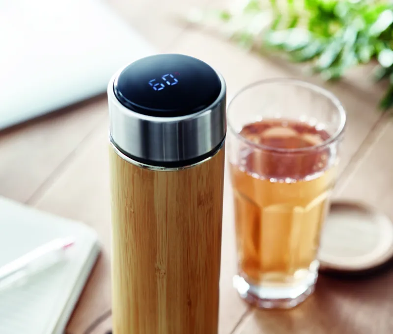 Duplafalú, rozsdamentes acélból és bambuszból készült termoszpalack teaszűrővel. A fedélben beépített LED-es érintős hőmérővel. 1 cserélhető CR2032 elemmel szállítjuk. Űrtartalom: 480 ml. Szivárgásmentes. A bambusz természetes anyag, színében, mintázatában és méretében esetenként eltérő lehet.