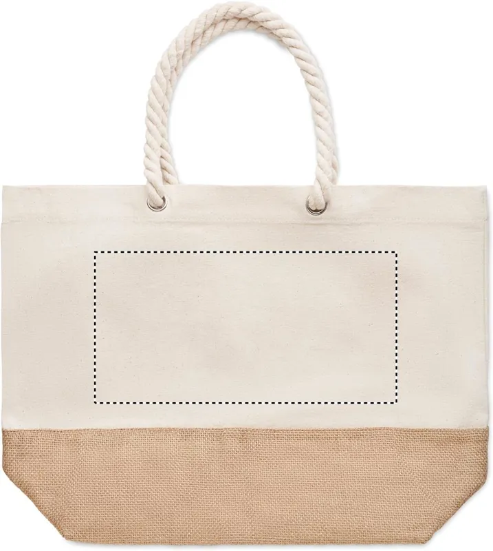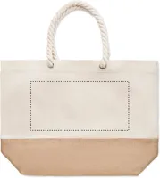 Strandtáska vagy bevásárlótáska vászonból, kötél füllel és juta részlettel. 280 g vastag anyag.