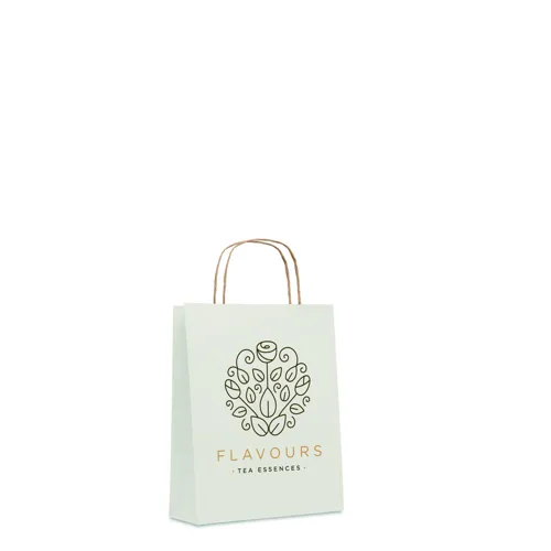Kis papír ajándéktasak. Egy papírtáska remek módja az ajándék tetszetős csomagolásának és átadásának. Kisebb tárgyak esetén akár hordtáskaként is használható. 90 g. vastag papírból. FSC®-certified | FSC MIX, P5.3, FSC-C213206