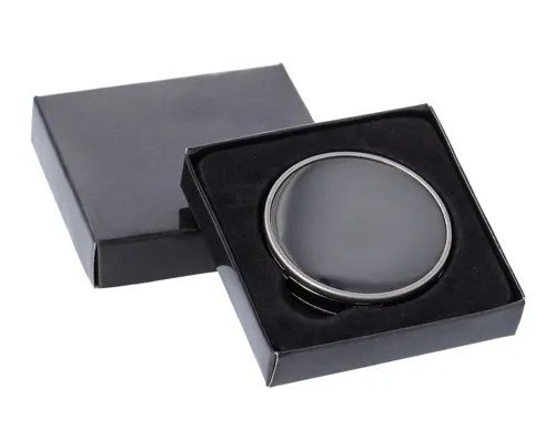 Mágneszáras, összecsukható, fém táskafogas fényes felületű fém betéttel. Fekete kartondobozban szállítjuk.