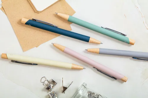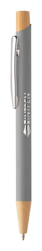 Újrahasznosított alumínium golyóstoll bambusz részekkel, gumírozott felülettel és króm klipsszel. Speciális bevonattal rendelkezik, amely különlegesen fényessé teszi a gravírozott emblémát. Kék tollbetéttel.