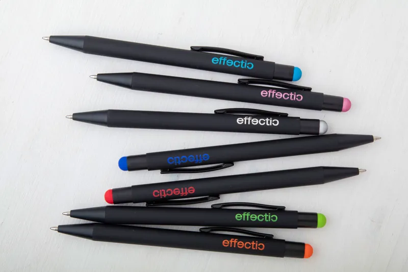 Alumínium golyóstoll érintőképernyős funkcióval, gumírozott felülettel. Különleges bevonattal, melynek gravírozása után az embléma az érintőképernyős véggel harmonizáló színben jelenik meg. Kék tollbetéttel szállítjuk.