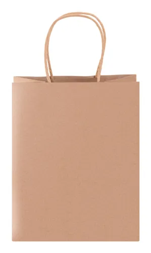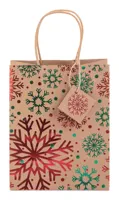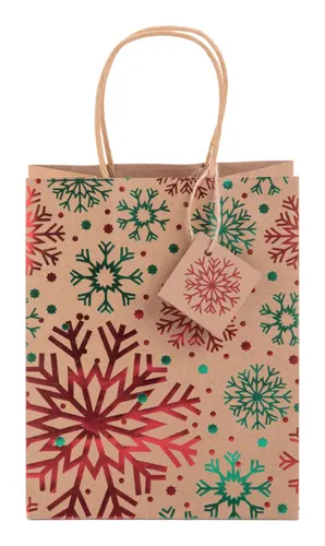 Újrahasznosított kraft papír ajándéktasak fóliázott karácsonyi mintával, sodrott fülekkel és ajándékcímkével. 140 g/m².