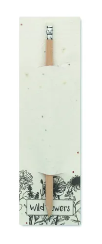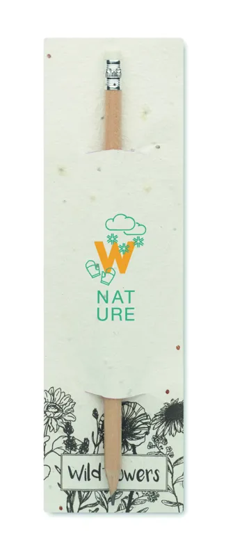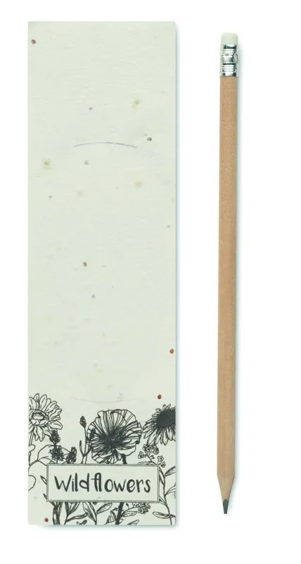 Fa ceruza radírral. Vadvirág magokat tartalmazó magpapír kísérőkártyával.