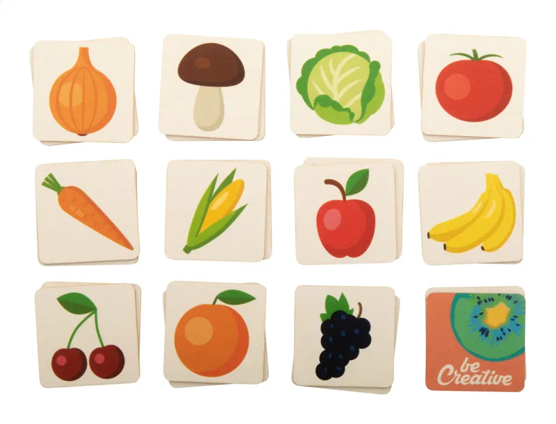 Kartonpapírból készült memóriajáték tematikus grafikával, egyedi papírdobozban. 24 lapka (40×40 mm). Az ár tartalmazza a full colour nyomtatás költségét az összes lapka hátoldalán és a dobozon. Minimális rendelési mennyiség: 100 db.