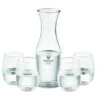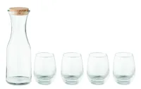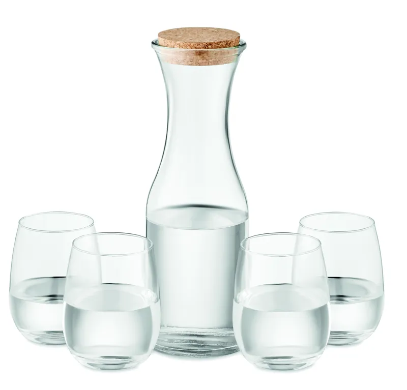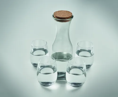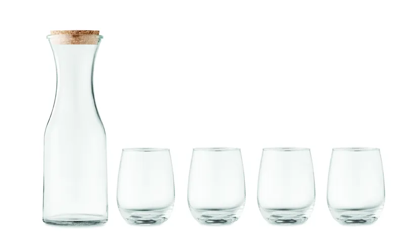 Újrahasznosított üvegből készült ital szervírozó készlet. Parafa fedeles, 1 literes kancsót és 4 db 420 ml-es poharat tartalmaz.A parafa 100%-ban természetes anyag. Szerkezeti jellege és felületi porozitása miatt az egyes tárgyak végső emblémázási eredménye eltéréseket mutathat.