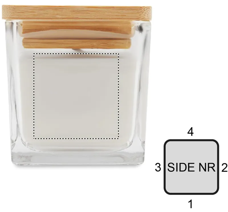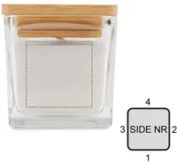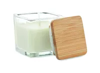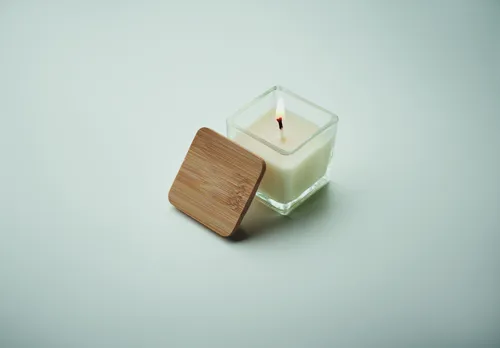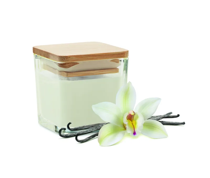Illatosított növényi alapú viaszgyertya szögletes üvegtartóban, bambuszfedéllel. 50 g. Égési idő: 8 óra. Aroma: fehér (06) vanília, sárga (08) citrom, narancs (10) narancs, zöld (48) alma.