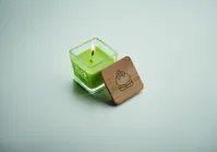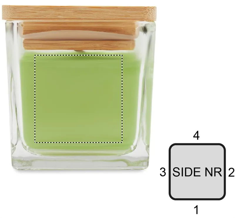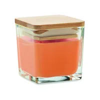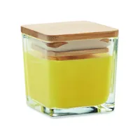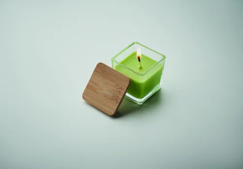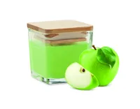 Illatosított növényi alapú viaszgyertya szögletes üvegtartóban, bambuszfedéllel. 50 g. Égési idő: 8 óra. Aroma: fehér (06) vanília, sárga (08) citrom, narancs (10) narancs, zöld (48) alma.