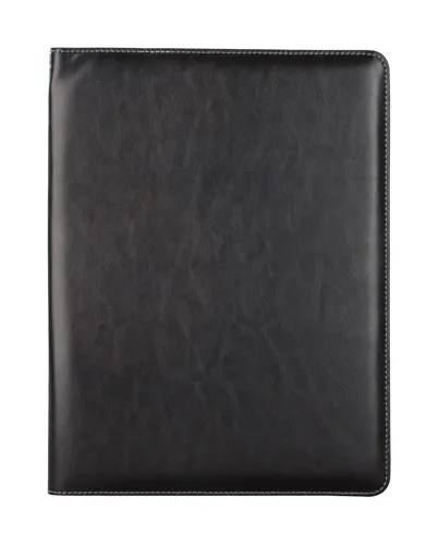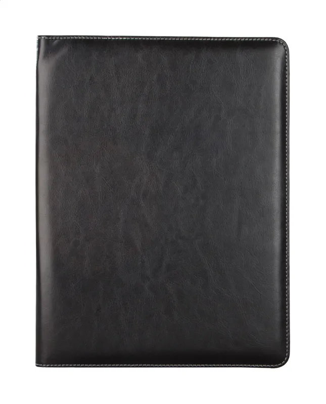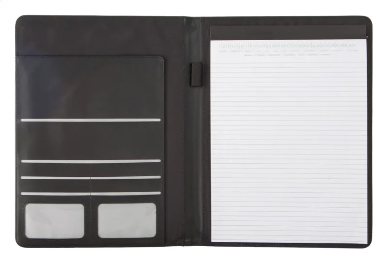 A4-es méretű, PU bőr iratmappa 20 lapos vonalas jegyzetfüzettel, toll- és névjegykártya tartóval.