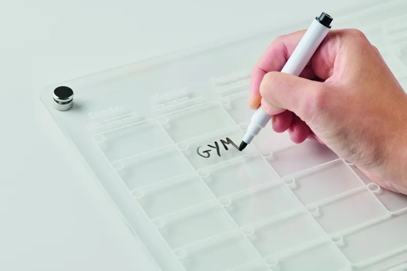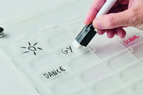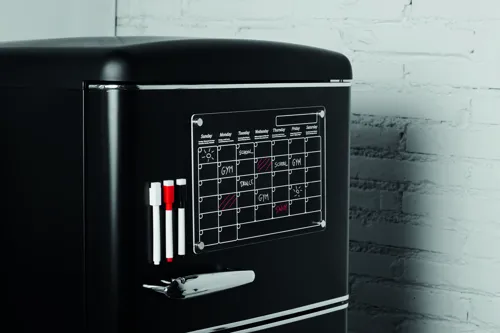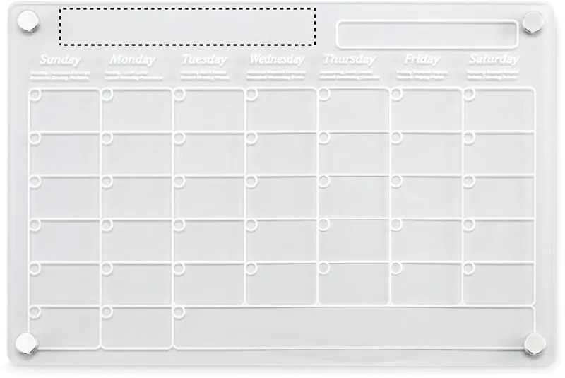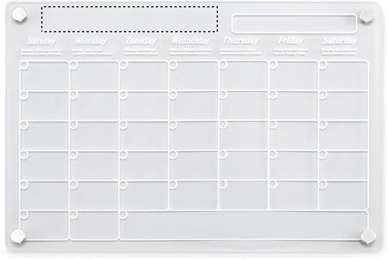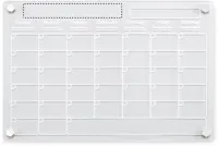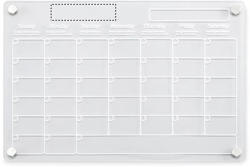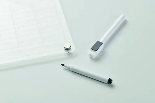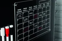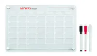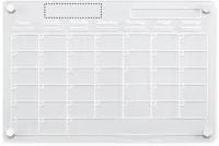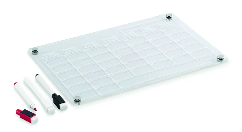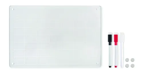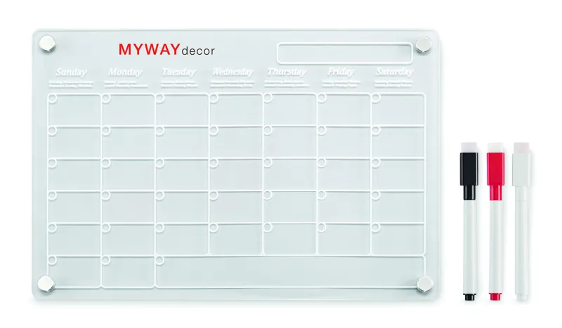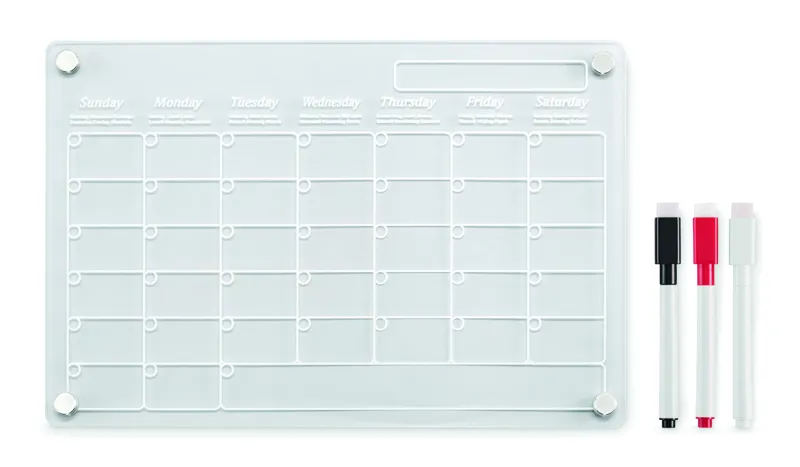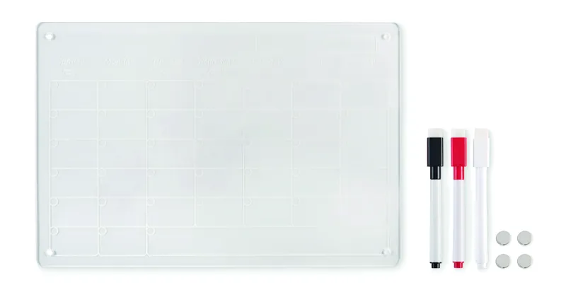 Mágneses akril havi tervező A4 méretben, 3 törölhető mágneses filccel (fekete, piros, fehér). Tartalmazza a rögzítéshez szükséges csavarokat.
