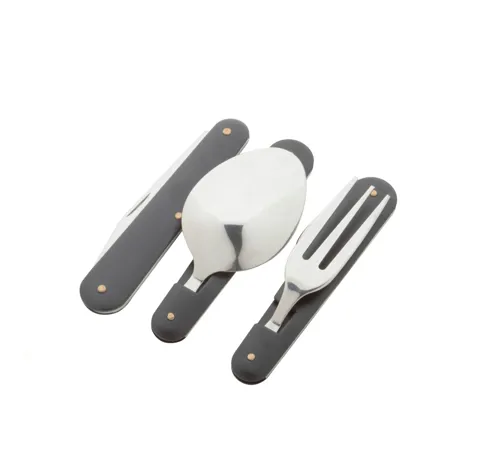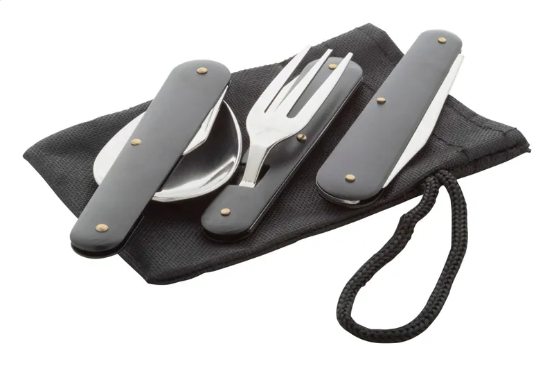 Összehajtható kemping evőeszköz szett rozsdamentes acélból, alumínium fogantyúval, 300D poliészter. Tartalma: villa, kés, kanál. Fekete hordtáskában.