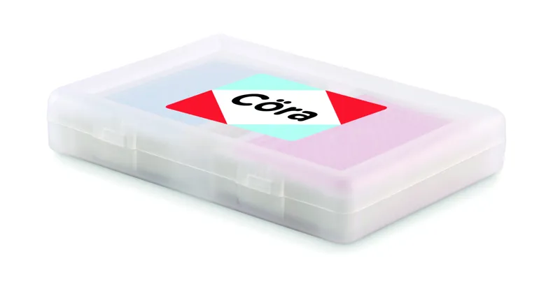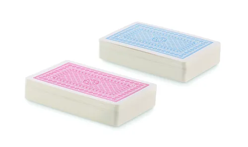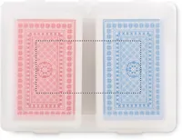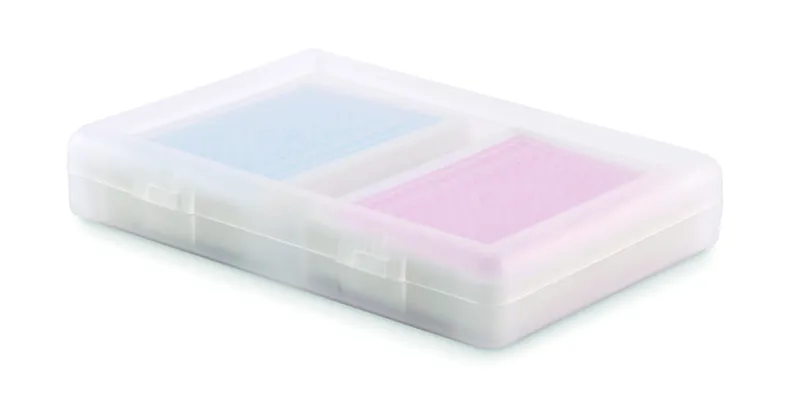2 paklis franciakártya készlet újrahasznosított PP tokban. 2x54 kártyalap (piros és kék hátlappal).
