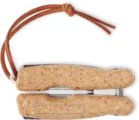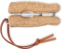 Rozsdamentes acél multifunkciós zsebkés parafa borítással, PU zsinórral. 9 funkció: fogó, üveg- és konzervnyitó, csillag- és két különböző laposfejű csavarhúzó, fűrész, kés, reszelő.A parafa 100%-ban természetes anyag. Szerkezeti jellege és felületi porozitása miatt az egyes tárgyak végső emblémázási eredménye eltéréseket mutathat.