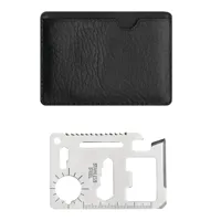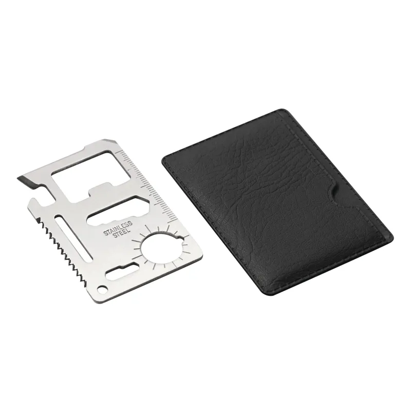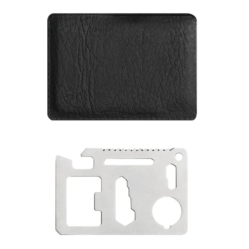 POCKET CARD multifunkciós túlélő kártya, eszköz: 11 funkcióval, mint például konzervnyitó, kés, csavarhúzó, vonalzó, sörnyitó, csavarkulcs különféle anyákhoz és csavarfejekhez, PU tokban szállítva