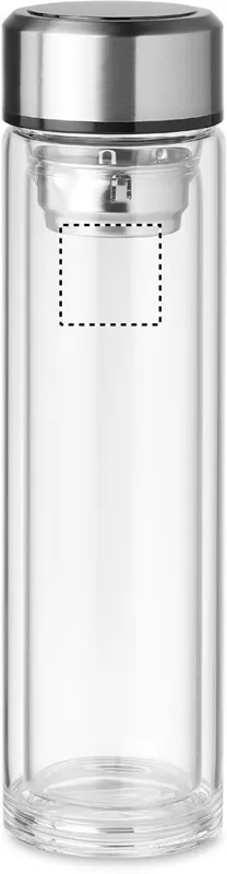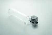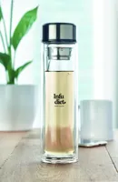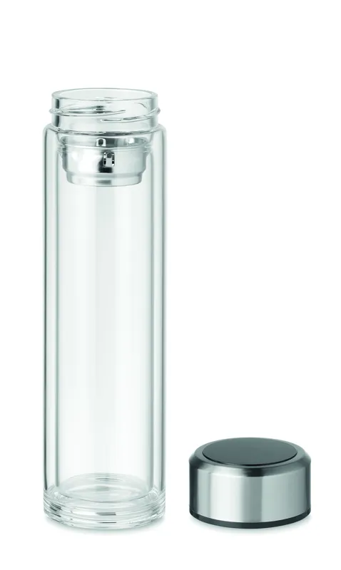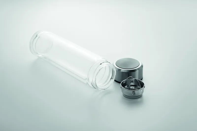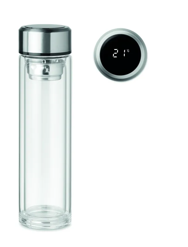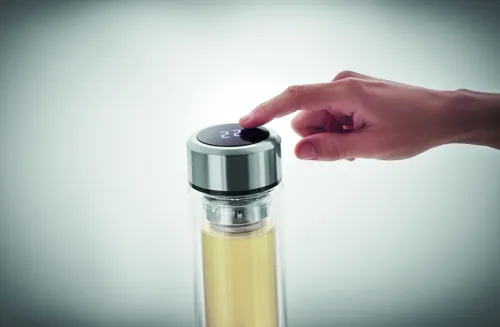 Duplafalú boroszilikát üveg palack. A kupakban beépített LED érintős hőmérővel, teaszűrővel. A működéshez szükséges 1 cserélhető CR2032 elemmel szállítjuk. Űrtartalom: 390 ml. Szivárgásmentes.
