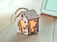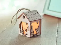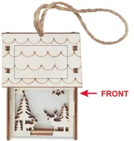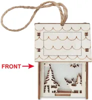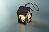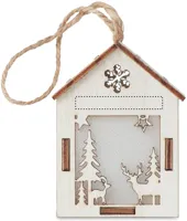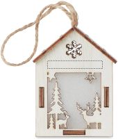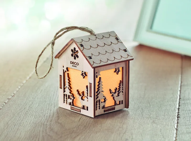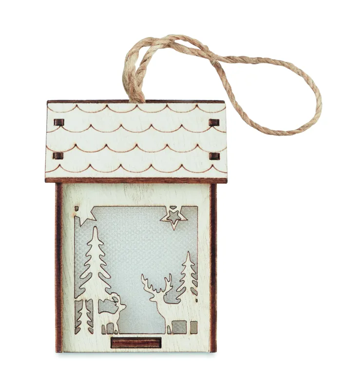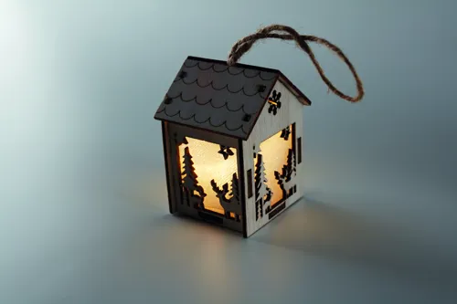 MDF fából készült házikó függeszték, karácsonyi motívumokkal, belül világítással. A működéshez szükséges 3 db AG10 elemmel szállítjuk.