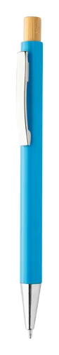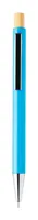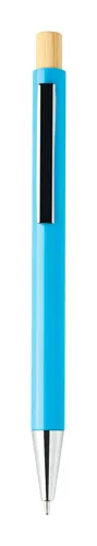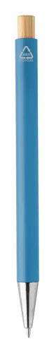 Újrahasznosított ABS műanyag golyóstoll bambusz gombbal és fém klipsszel. Kék tollbetéttel.