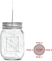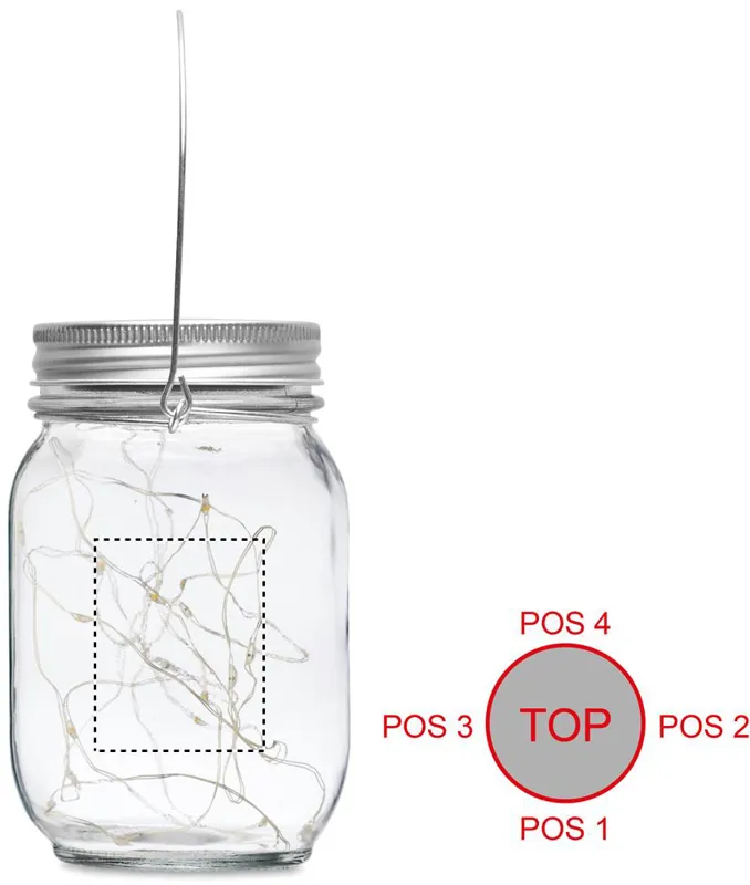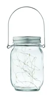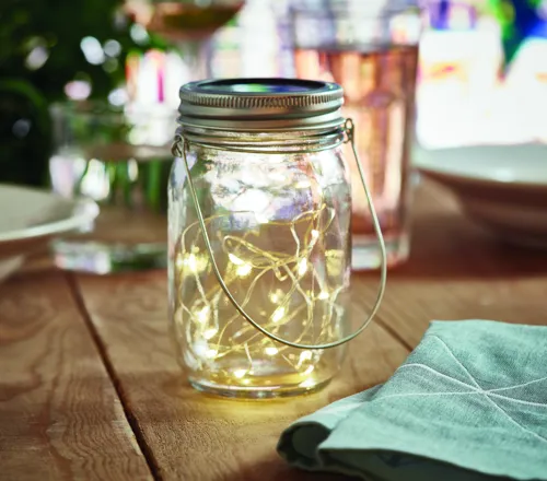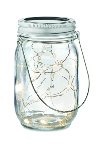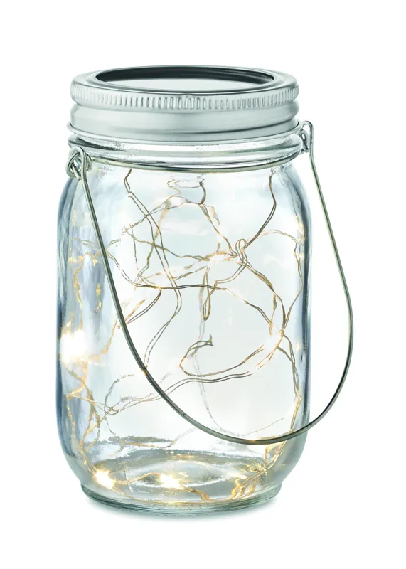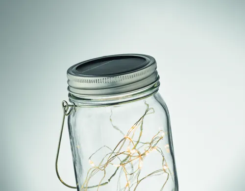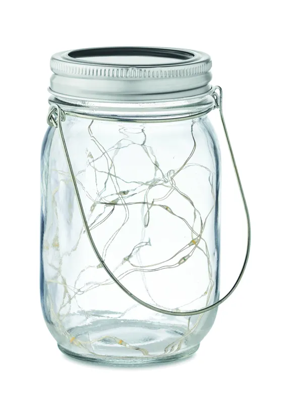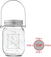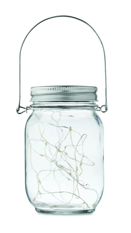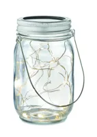 Napelemes befőttesüveg kültéri lámpa 20 LED-es fényfüzérrel. Akasztóval a tetején. Üzemidő kb. 5 óra. 300 mAh nikkel-metálhidrid akkumulátorral. IP44.