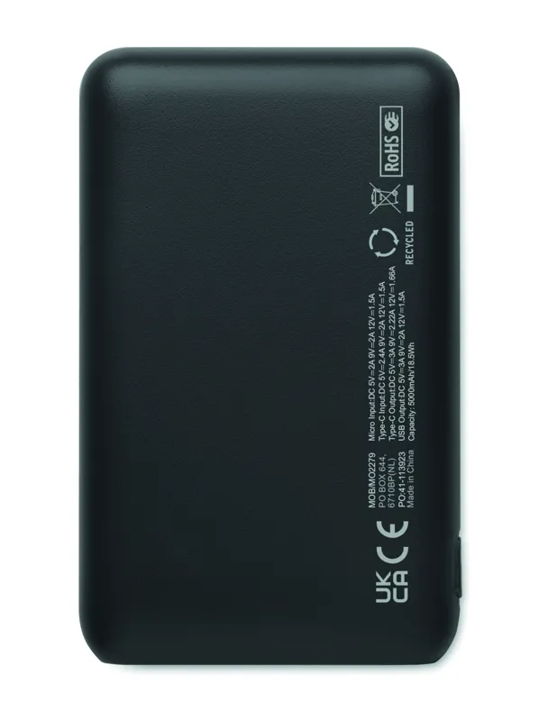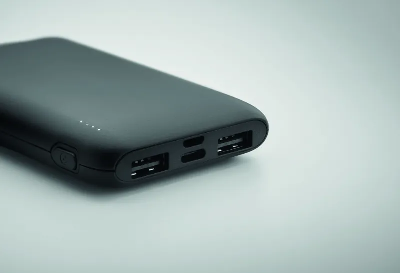 5000 mAh powerbank külső akkumulátor újrahasznosított ABS-ből. Teljesítmény DC5V/2A, 2x USB-A típusú és 1x C-típusú be/kimenet és 1x mikro-B típusú bemenet.