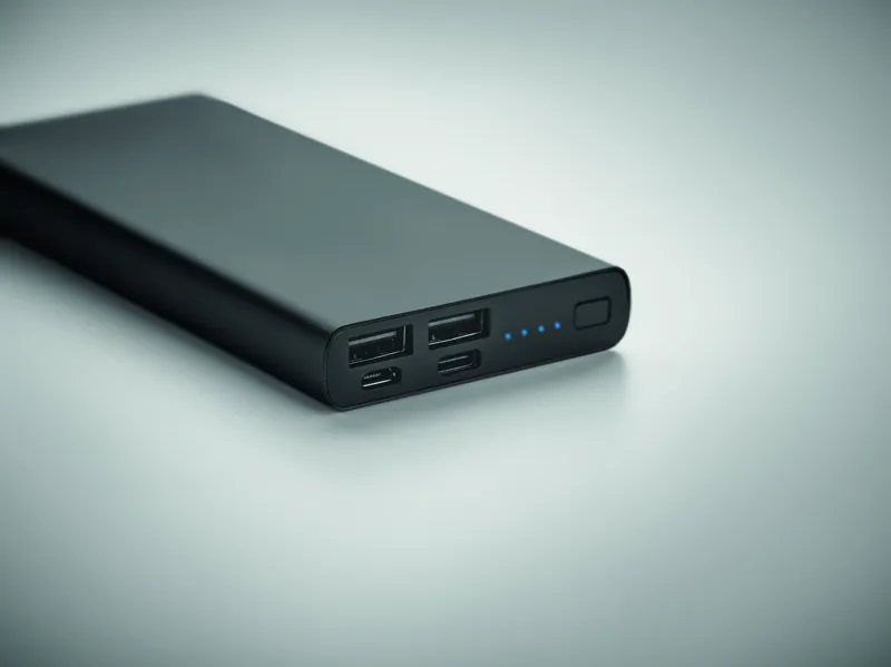 10000 mAh, újrahasznosított alumínium külső akkumulátor. Okostelefonok töltéséhez, teljesítmény DC5V/1A és DC5V/2A . Jelzőfénnyel és USB töltőkábellel. Támogatja a gyorstöltési technológiát (18W). C típusú be- és kimenet. PD (Power Delivery) támogatással a legújabb laptopok töltéséhez.