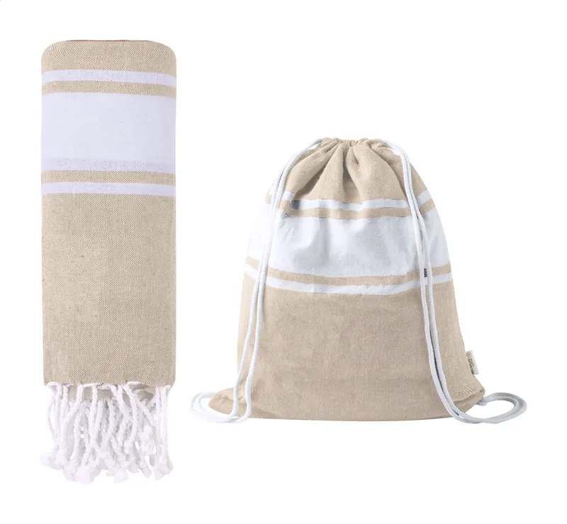 Kéttónusú pareo strandtörölköző újrahasznosított pamutból, hozzáillő színű zsinóros hordtáskával. 100% újrahasznosított pamut, 170 g/m².