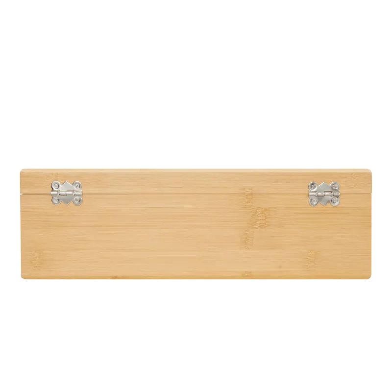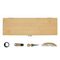 PRECIOUS PLUS boroskészlet, 5 darabos, 1 palackhoz: rozsdamentes acél cseppentőgyűrűből, fa gombbal ellátott fém palackdugóból, fa záródugóval ellátott fém kiöntőből és fa nyéllel ellátott rozsdamentes acél pincérkésből áll, bambusz tokban és dobozban.