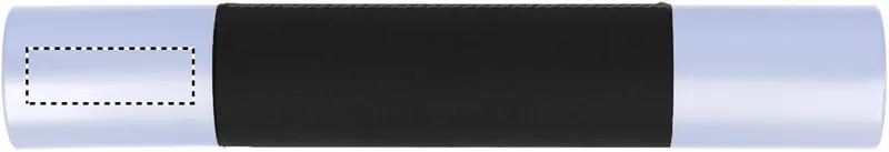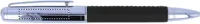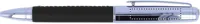 Fém golyóstoll ezüst színű krómozott felülettel és PU bőr borítással, hengeres alumínium tolltartóban. Feketén író betéttel.