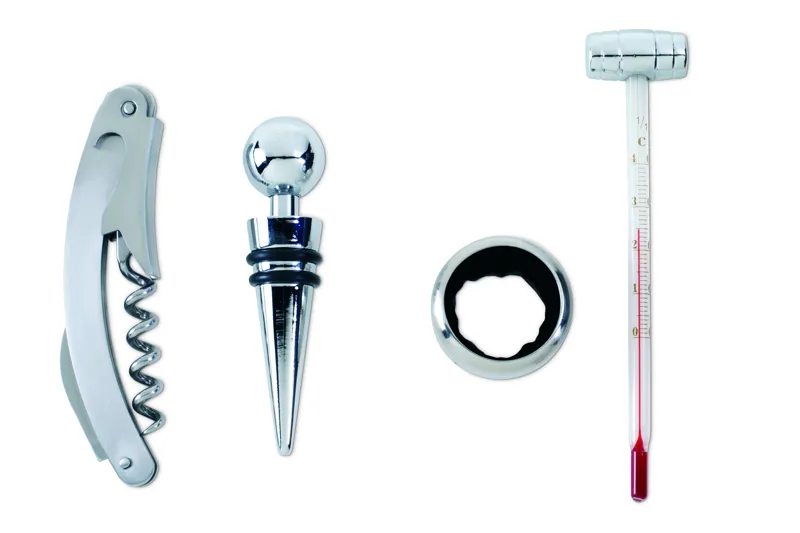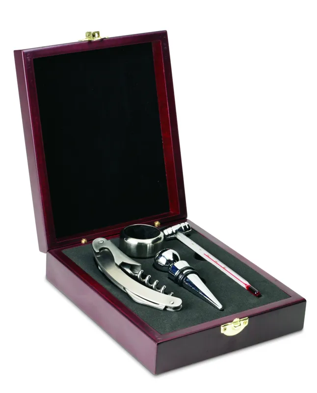 Elegáns boros készlet fadobozban. Dugóhúzót, palack visszazárót, cseppfogó gyűrűt és hőmérőt tartalmaz.