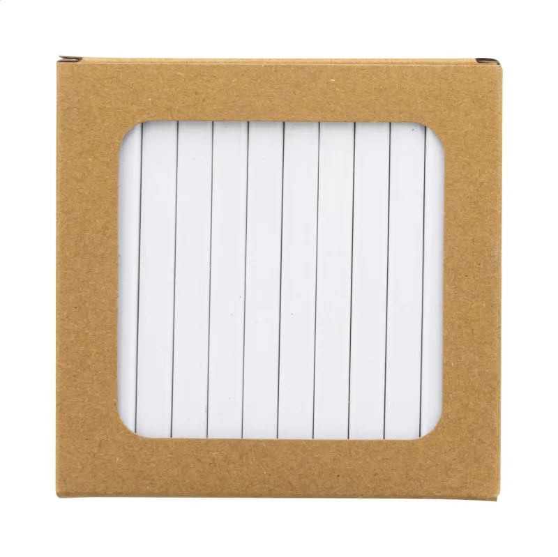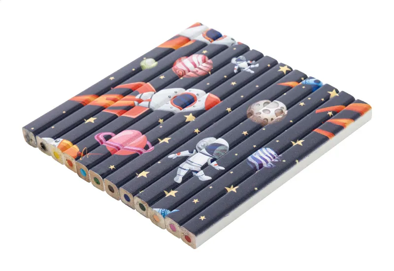 12 darabos téglalap alakú, fából készült színes ceruza szett, fehér kivitelben. Nagyméretű, kivágott kraft papír dobozban. Ideális UV LED nyomtatáshoz.