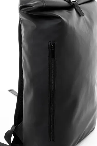 Vízálló, puha újrahasznosított PU bőr rolltop hátizsák csattal, cipzáras első zsebbel és párnázott laptoprekesszel (15"). Párnázott hát- és vállpántokkal. Megkülönböztető újrahasznosított PU bőr címkével.