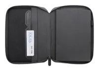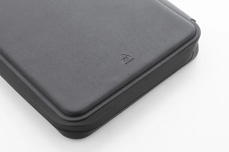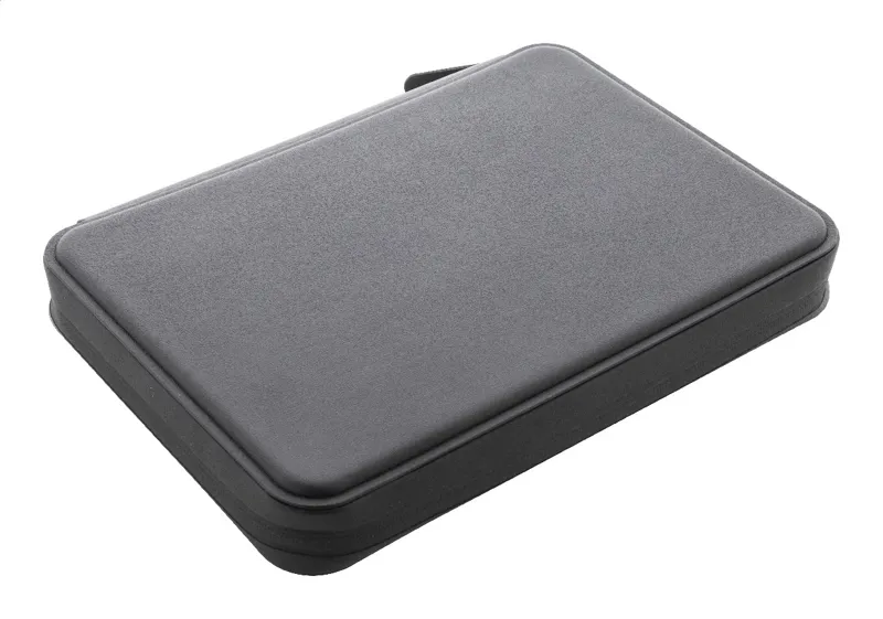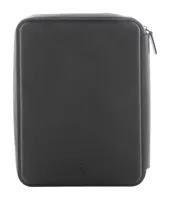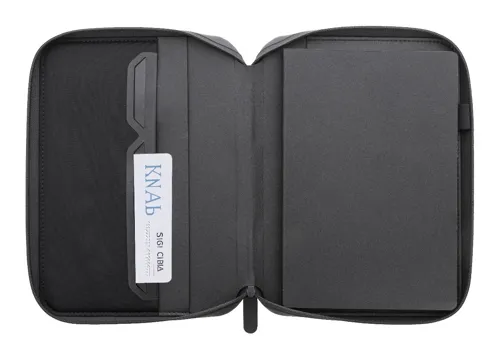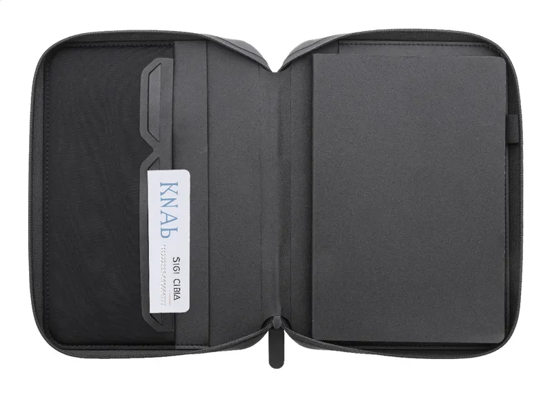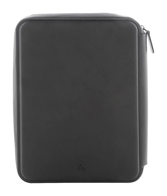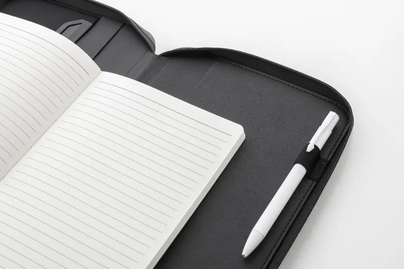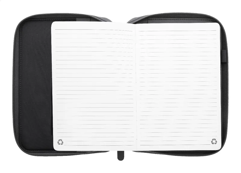 Cipzáras, luxus iratmappa újrahasznosított PU bőrből, 64 újrahasznosított papír anyagú, vonalas lapos jegyzetfüzettel. Több belső zsebbel kártyáknak és dokumentumoknak. A5 méret.