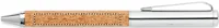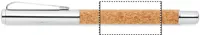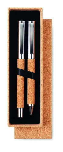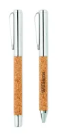 Fém tollkészlet csavarmechanikás golyóstollal és kupakos roller tollal, parafa tolltesttel, hozzá illő parafa ajándékdobozban. A golyóstoll kék, a roller feketén író betéttel. A parafa természetes anyag, szerkezeti jellege és felületi porozitása miatt az egyes tárgyak végső emblémázási eredménye eltéréseket mutathat.
