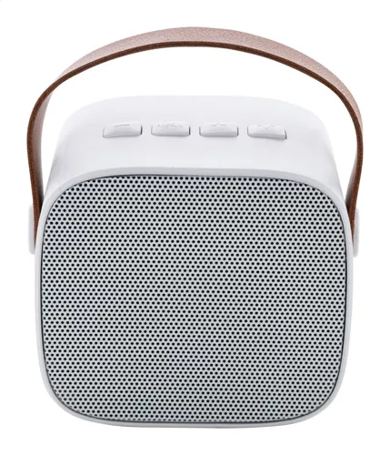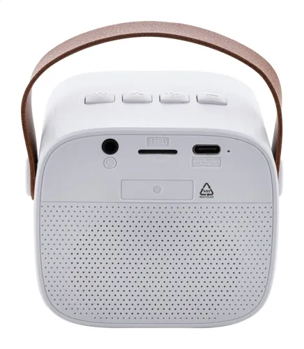 Újrahasznosított ABS vezeték nélküli hangszóró PU bőr hordszíjjal és beépített újratölthető akkumulátorral (1200 mAh). USB töltőkábellel.