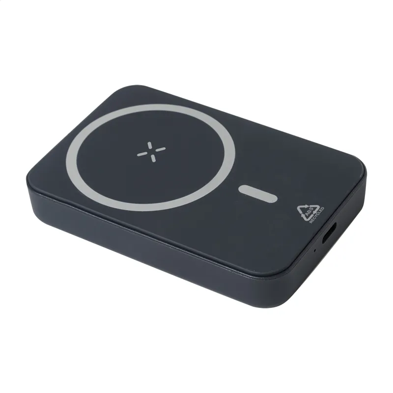 Újrahasznosított ABS power bank 5000 mAh akkumulátorral és beépített mágneses vezeték nélküli töltővel (5W). USB-C bemenettel és töltőporttal. Öntapadó fémgyűrűvel, amellyel bármilyen vezeték nélkül tölthető eszközön használhatja a mágneses funkcióját. Kompatibilis az iPhone® 12 vagy újabb készülékekkel. USB töltőkábellel.