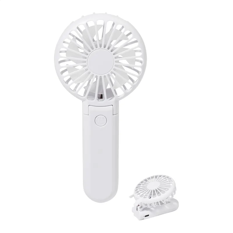 Újrahasznosított ABS elektromos kézi ventilátor beépített USB újratölthető akkumulátorral (400 mAh). Állítható szöggel és 3 sebesség fokozattal. USB töltőkábellel.
