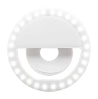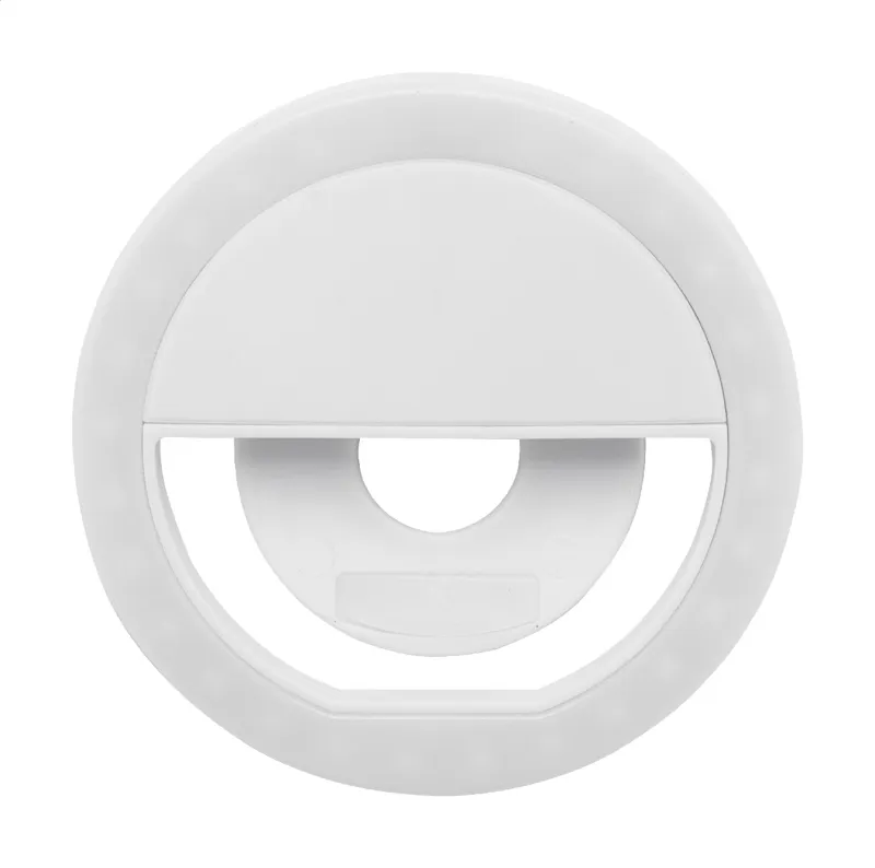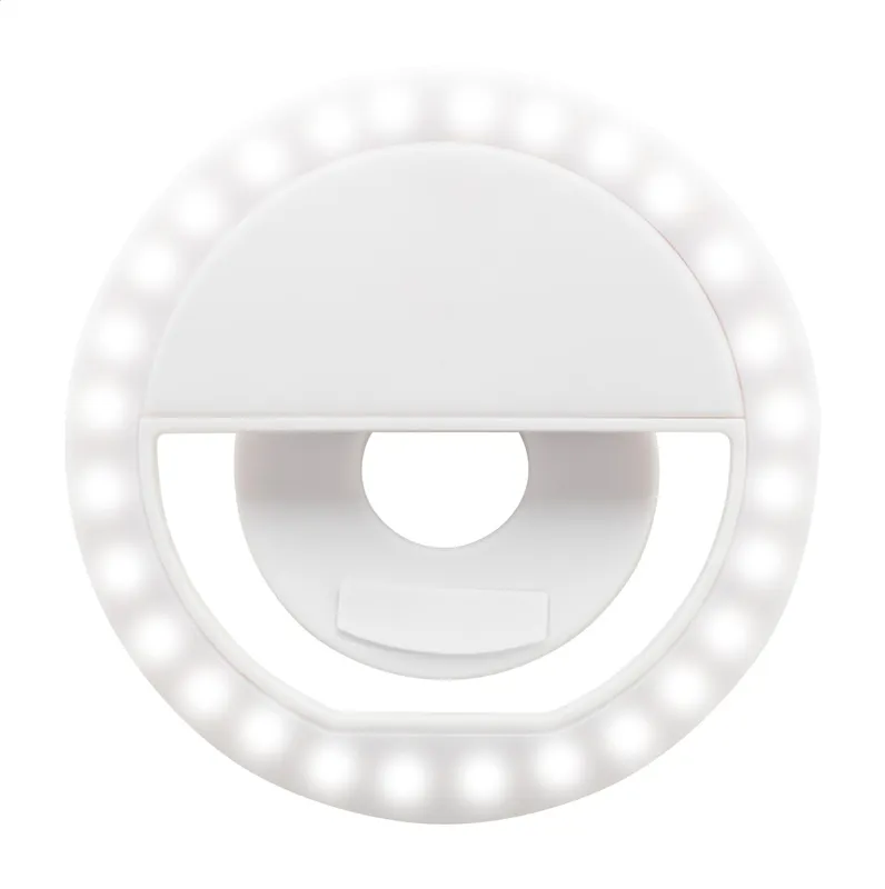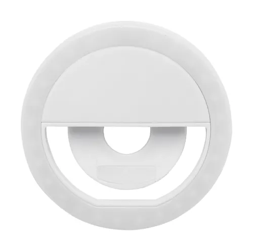 Újrahasznosított ABS műanyag szelfi lámpa 28 LED-del mobiltelefonokhoz. 3 állítható fényerő szinttel és beépített újratölthető akkumulátorral (150 mAh). USB töltőkábellel szállítjuk.