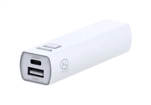 Újrahasznosított alumínium power bank 2600 mAh akkumulátorral. 1 USB és 1 USB-C töltőporttal. USB-C bemeneti porttal. USB töltőkábellel szállítjuk.