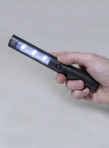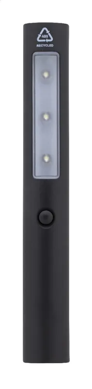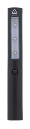 Újrahasznosított ABS műanyagból készült autós vészhelyzeti elemlámpa 3 LED-del és mágnesekkel a hátulján a kézhasználat nélküli használathoz. Gombelemmel szállítjuk.