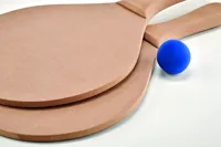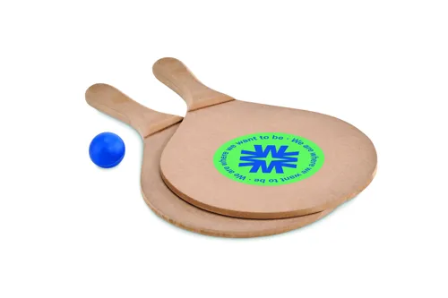 Strandtenisz szett, 2 MDF ütőt és 1 puha labdát tartalmaz. Húzózsinóros hálós pamut tárolótasakban szállítjuk.