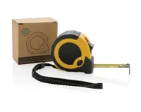3 méteres mérőszalag RCS (Recycled Claim Standard) újrahasznosított ABS-ből. Teljes újrahasznosított anyag tartalom: 17% a termék összsúlya alapján. Az RCS-tanúsítvány biztosítja az újrahasznosított anyagok ellátási láncát. Elegáns TRP gumimarkolattal az egyenletes fogásért. Kiold/zár gombbal és extra tartó gombbal az oldalán. 16 mm-es egyoldalas sárga mérőszalaggal, fekete szénacél kampóval. Poliészter csuklópánttal. FSC® mix kraft csomagolásban.