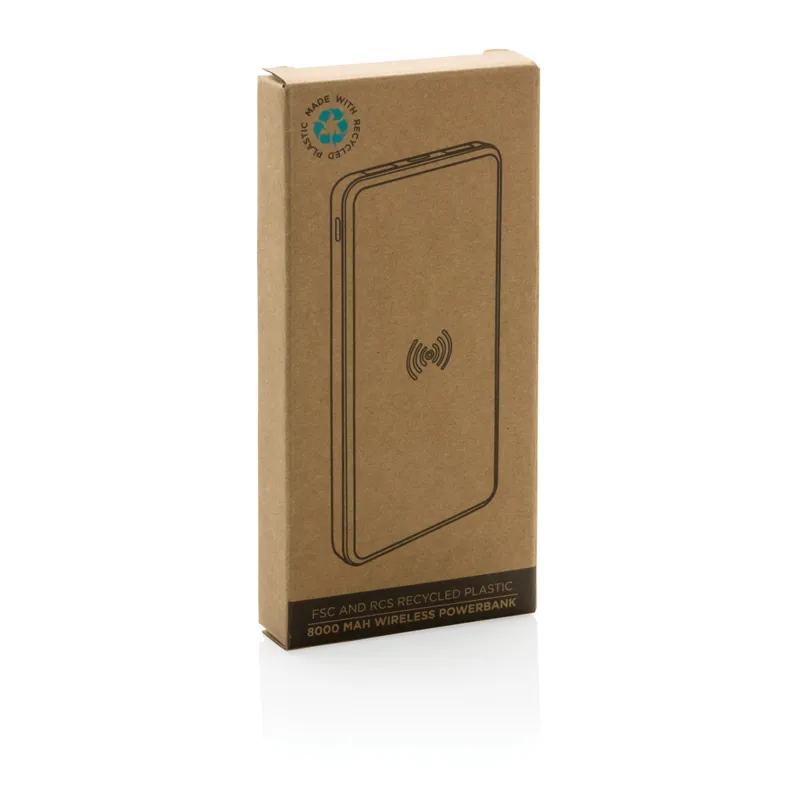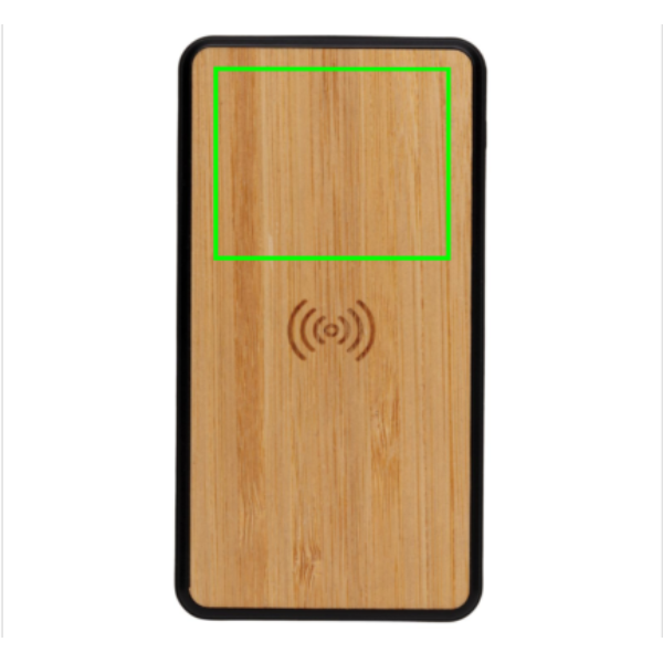 RCS (Recycled Claim Standard) újrahasznosított ABS műanyagból készült 8000 mAh powerbank puha tapintású felülettel és FSC® bambusszal. Teljes újrahasznosított anyag tartalom: 17% a termék összsúlya alapján. Az RCS-tanúsítvány biztosítja az újrahasznosított anyagok ellátási láncát. Támogatja az 5W-os vezeték nélküli töltést valamint az USB-porton keresztüli töltést kábellel. Mind micro USB, mind C típusú bemenet. Teljesen feltöltve elegendő energiát biztosít mobiltelefonjának akár négyszeres felltéséhez. A powerbank hosszú élettartamú, A fokozatú, 8000 mAh lítium-polimer akkumulátort tartalmaz. A teljesítményjelzők jelzik a fennmaradó energiaszintet. Micro bemenet 5V/2A, C típusú bemenet 5V/2A, USB kimenet 5V/2,4A. Vezeték nélküli kimenet 5W/1A. FSC® mix csomagolásban. RCS újrahasznosított TPE töltőkábellel.