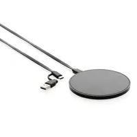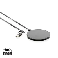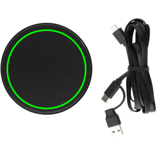 10W-os vezeték nélküli töltő dupla csatlakozó kábellel (USB A és C típus). RCS tanúsított újrahasznosított ABS műanyag tartóban, újrahasznosított TPE kábellel. Teljes újrahasznosított tartalom: 58% a termék teljes súlya alapján. Az RSC (Recycled Claim Standard) szabvány egy termék újrahasznosított anyag tartalmát igazolja a teljes ellátási lánc során. A vezeték nélküli töltés az Android telefonok legújabb generációjáva, iPhone 8 és újabb készülékekkel kompatibilis. Bemenete: 9V/1.5A. Vezeték nélküli kimenete: 9V/1.1A, 10W. A termék és kiegészítői PVC-mentesek. 150cm hosszú PVC-mentes, újrahasznosított TPE kábellel, mely USB A vagy C típusú adapterhez is csatlakoztatható.