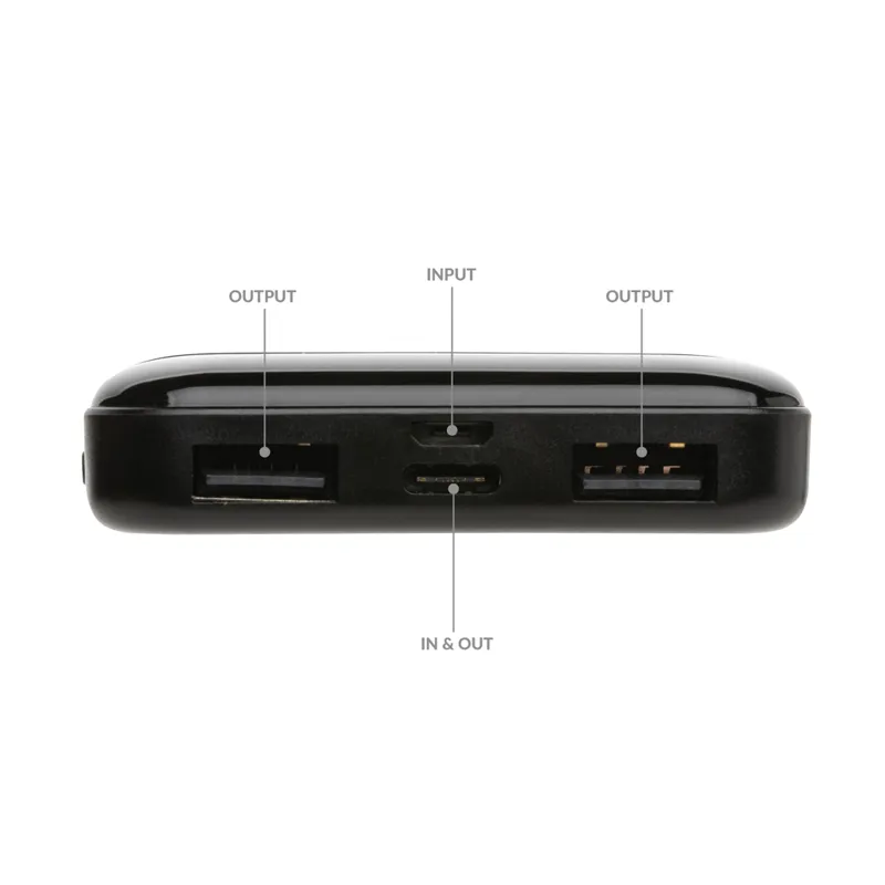 5000 mAh zsebméretű powerbank RCS újrahasznosított ABS műanyag házzal. Az RCS-tanúsítvány biztosítja az újrahasznosított anyagok ellátási láncát. Teljes újrahasznosított anyag tartalom: 30% a termék összsúlya alapján. Teljesen feltöltött állapotban a powerbankkel akár kétszer újratölthető a mobiltelefon. A powerbank hosszú élettartamú, A fokozatú, 5000 mAh lítium-polimer akkumulátort tartalmaz. Töltöttségjelzővel. Micro USB bemenet 5V/2A; C típusú bemenet 5V/2,4A; USB kimenet 5V/2,4A, C típusú kimenet: 5V/2A Termék és tartozékai PVC-mentesek. RCS újrahasznosított TPE töltőkábellel. FSC® mix csomagolásban.