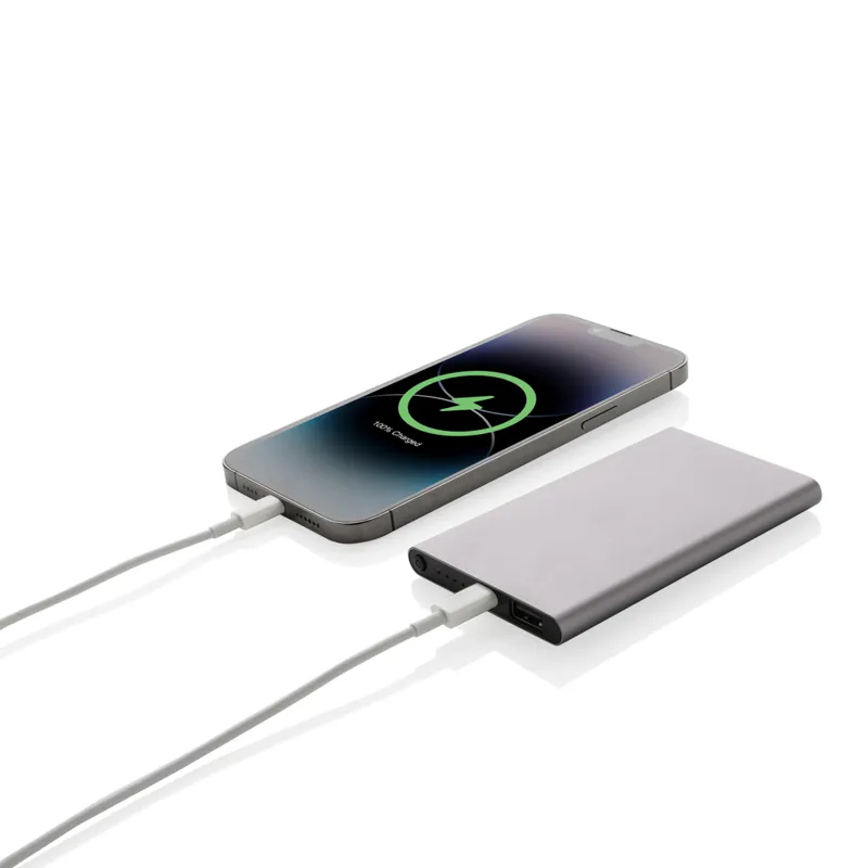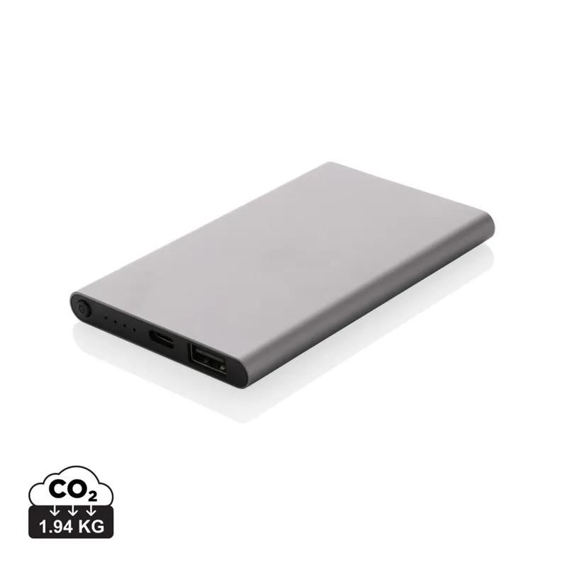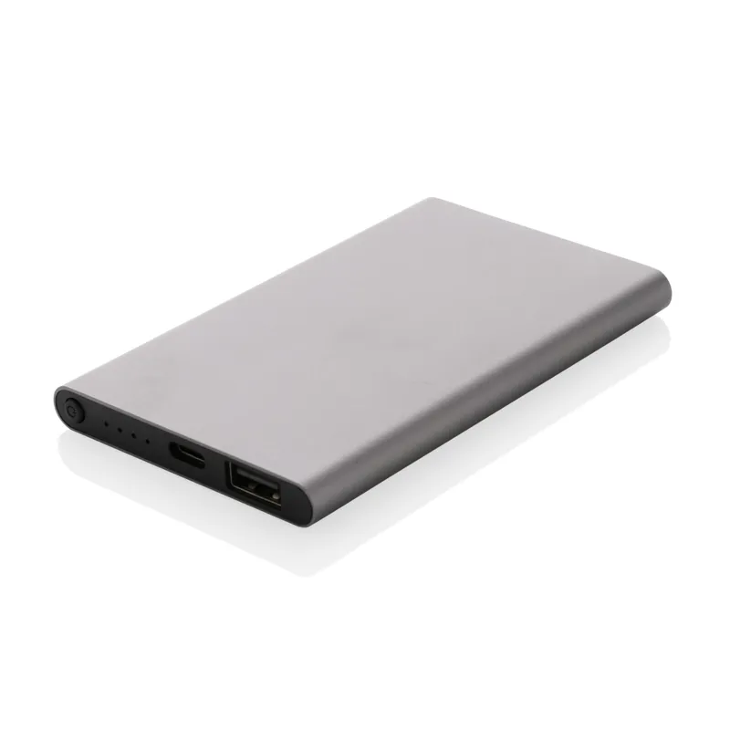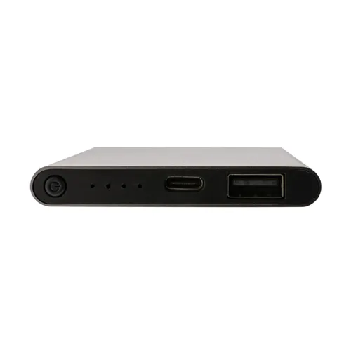 4000 mAh-s, lapos kialakítású powerbank melynek háza RCS újrahasznosított alumínium/ABS műanyagból készült. Az RCS-tanúsítvány biztosítja az újrahasznosított anyagok ellátási láncát. Teljes újrahasznosított anyagtartalom: 36% a termék összsúlya alapján. A powerbank támogatja mind az USB-A-n, mind a C típusún keresztüli töltést. Hosszú élettartamú, A-fokozatú, 4000 mAh-s lítium-polimer akkumulátorral. A teljesítményjelzők jelzik a fennmaradó energiaszintet. ; C típusú bemenet: 5 V/2 A; C típusú kimenet: 5 V/2 A USB-A kimenet: 5 V/2 A. A termék és tartozékai PVC-mentesek. RCS újrahasznosított TPE töltőkábellel. FSC® mix csomagolásban.