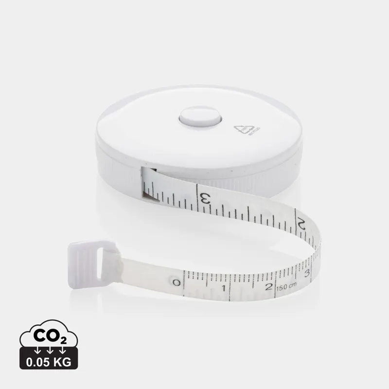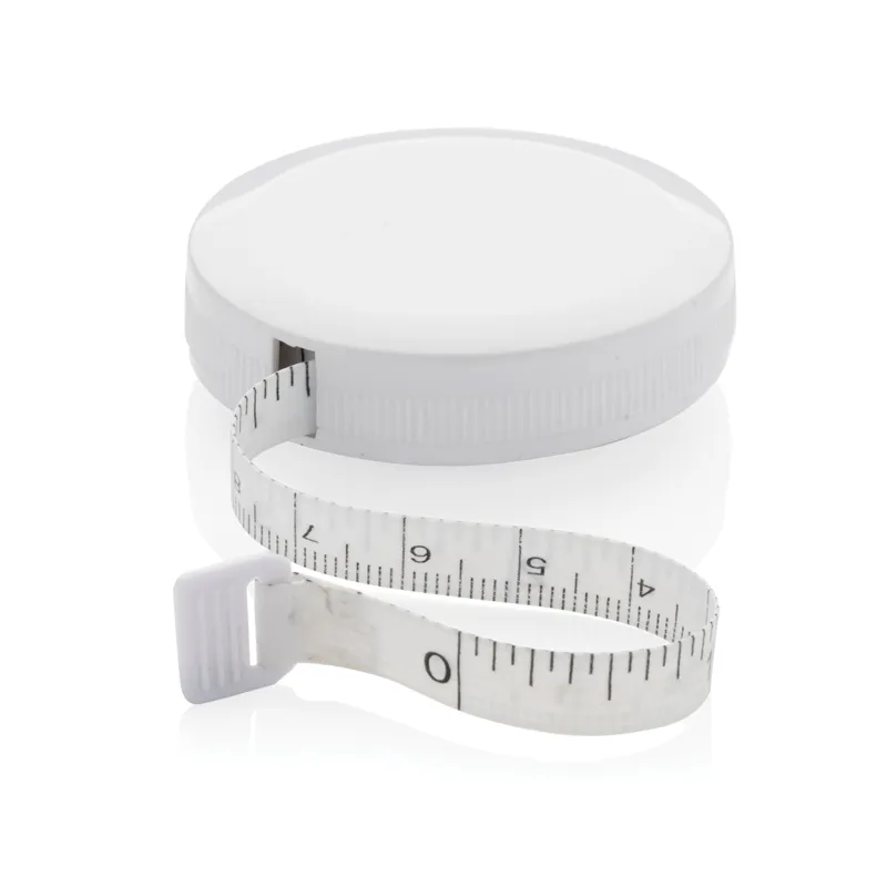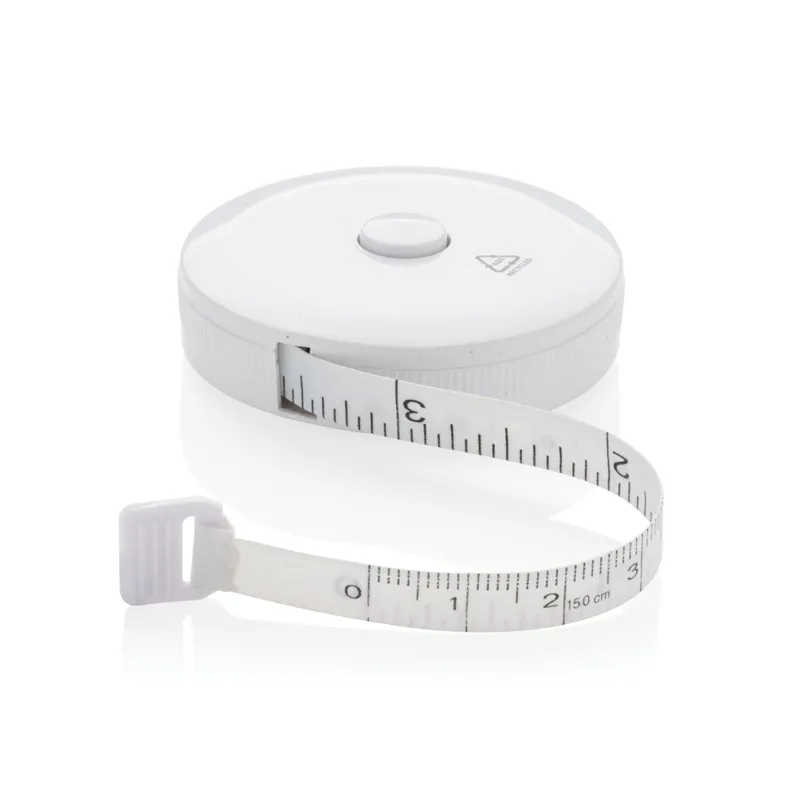 1,5 m/60 hüvelykes újrahasznosított műanyag szalag visszahúzó gombbal, fitneszhez és divathoz. A tok RCS újrahasznosított ABS műanyagból és üvegszálból készül. Teljes újrahasznosított anyag tartalom: 64% a termék összsúlya alapján. Az RCS-tanúsítvány biztosítja az újrahasznosított anyagok ellátási láncát. A szalag 8 mm széles és gombnyomásra visszahúzható. FSC® mix csomagolásban.