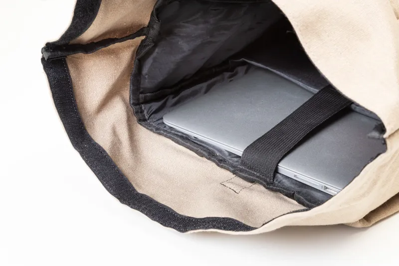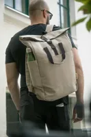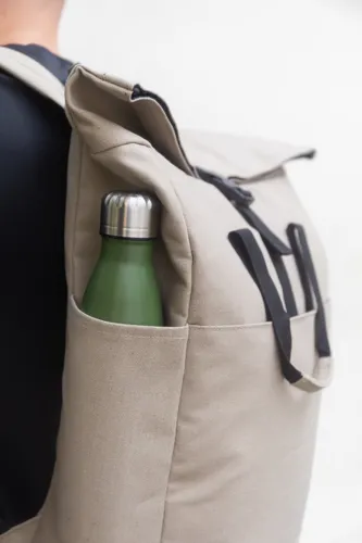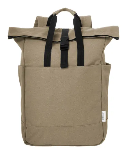 Újrahasznosított vászon rolltop hátizsák csattal és tépőzárral, párnázott laptop rekesszel (15"), elülső és oldalsó zsebekkel. Bőröndpánttal, párnázott hát- és vállpántokkal. 70% újrahasznosított pamut és 30% RPET poliészter. Megkülönböztető újrahasznosított pamut címkével.