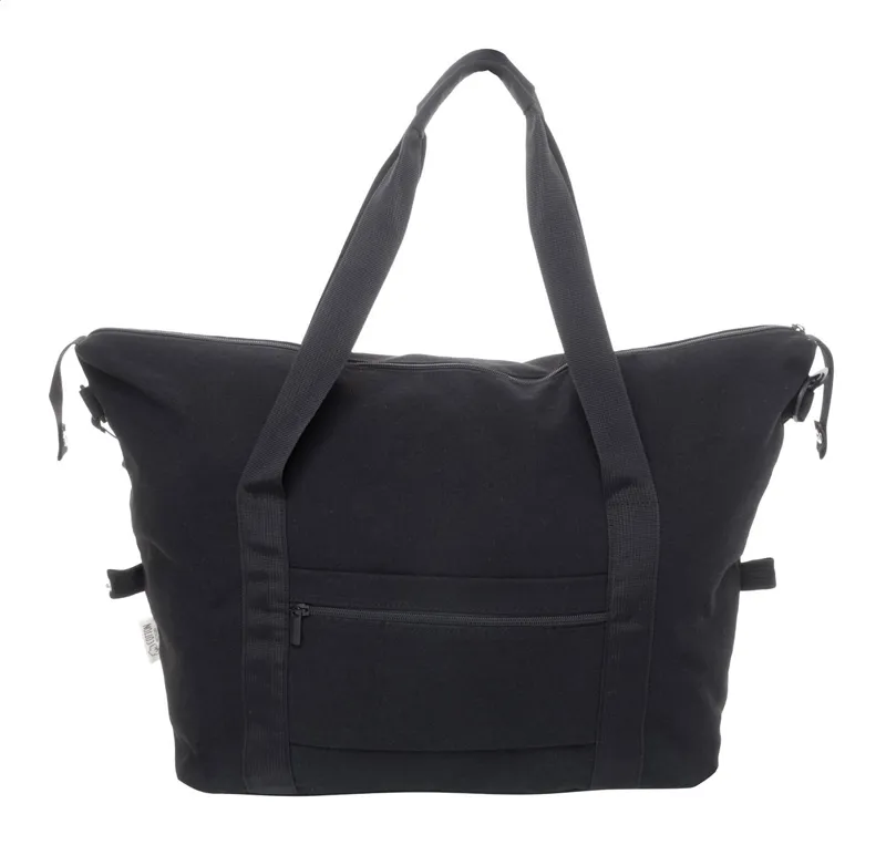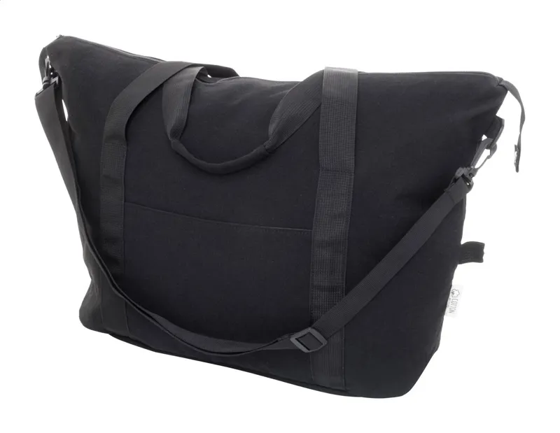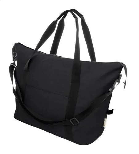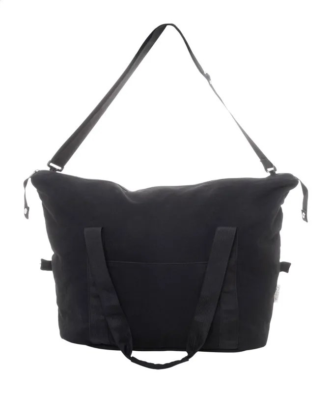 Újrahasznosított vászon utazó- és sporttáska cipzáras fő rekesszel, elülső zsebbel, állítható vállpánttal és cipzáras hátsó zsebbel, amely bőröndpántként is funkcionál. 70% újrahasznosított pamut és 30% RPET poliészter. Megkülönböztető újrahasznosított pamut címkével.
