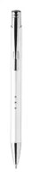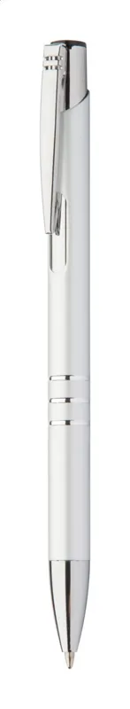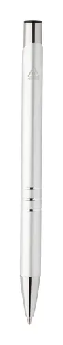 Újrahasznosított alumínium golyóstoll, fémes felülettel és kék tollbetéttel.