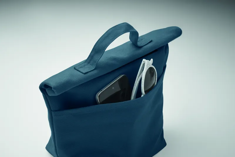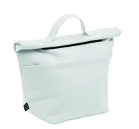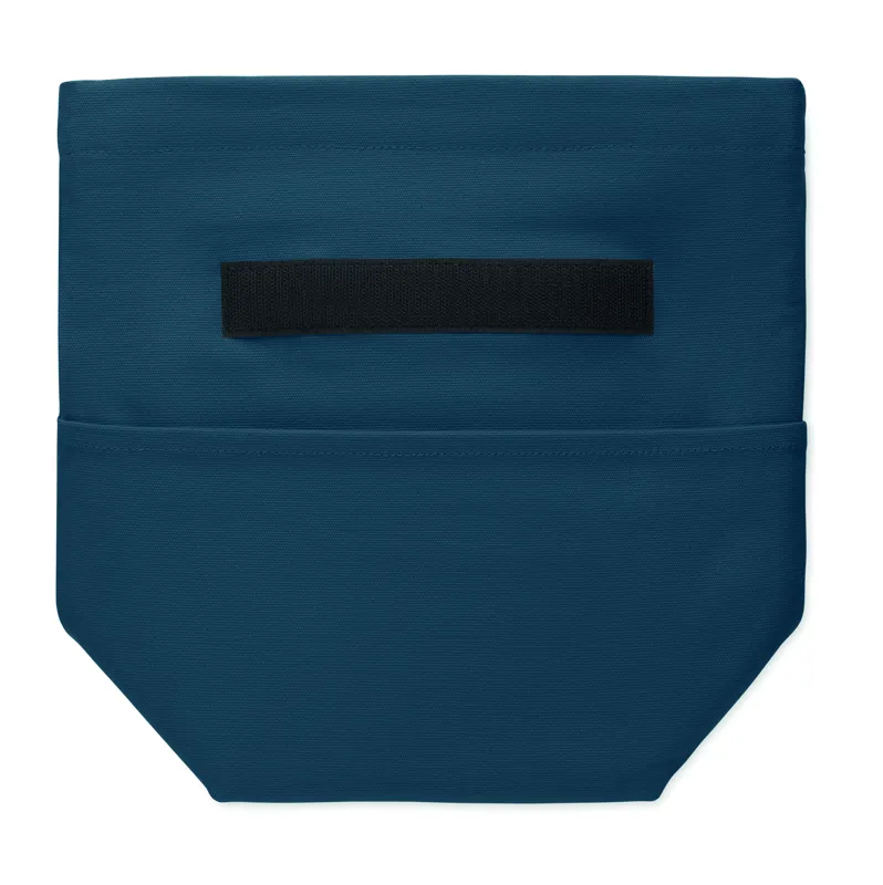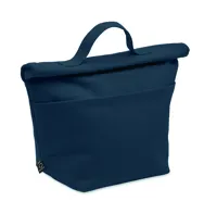 Újrahasznosított kevertszálas (70% újrahasznosított pamut, 30% újrahasznosított poliészter) hőszigetelt uzsonnás táska, roll top csavart, tépőzáras záródással. Szigetelés: 3 mm-es PE hab 12C PEVA-val.